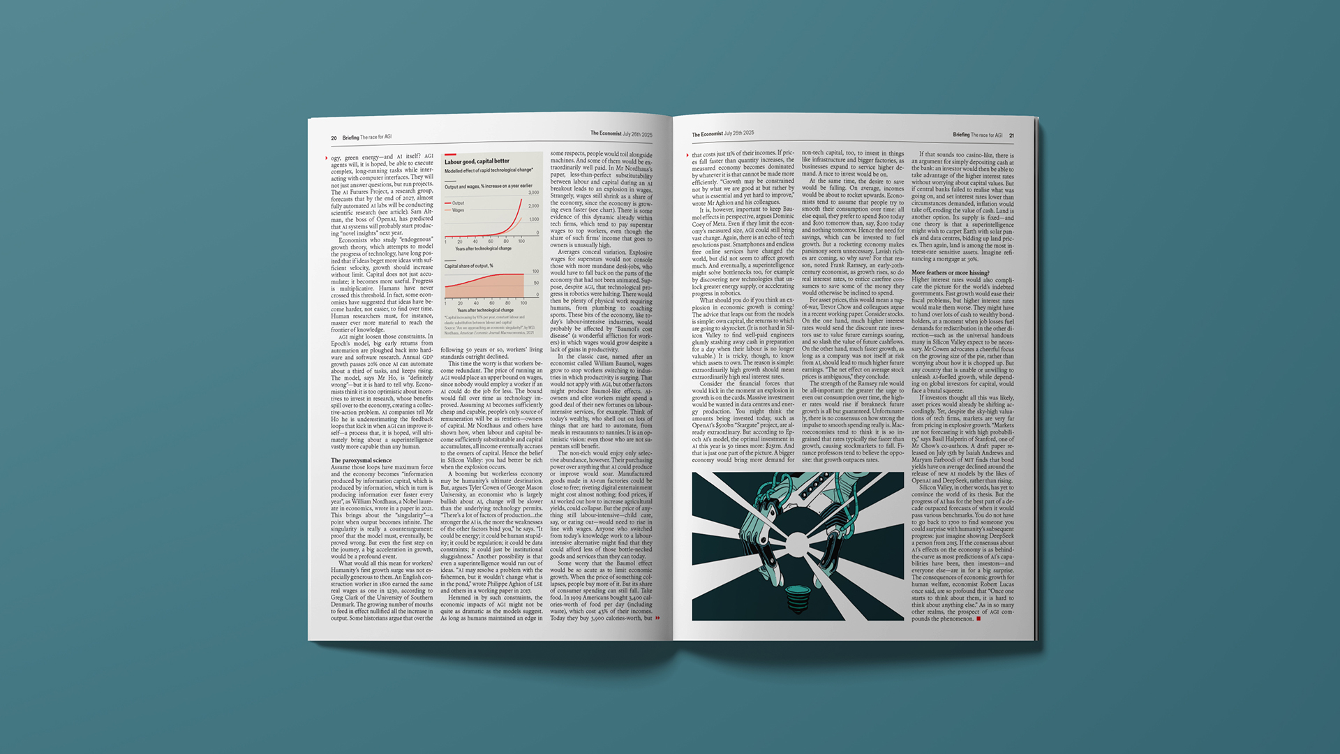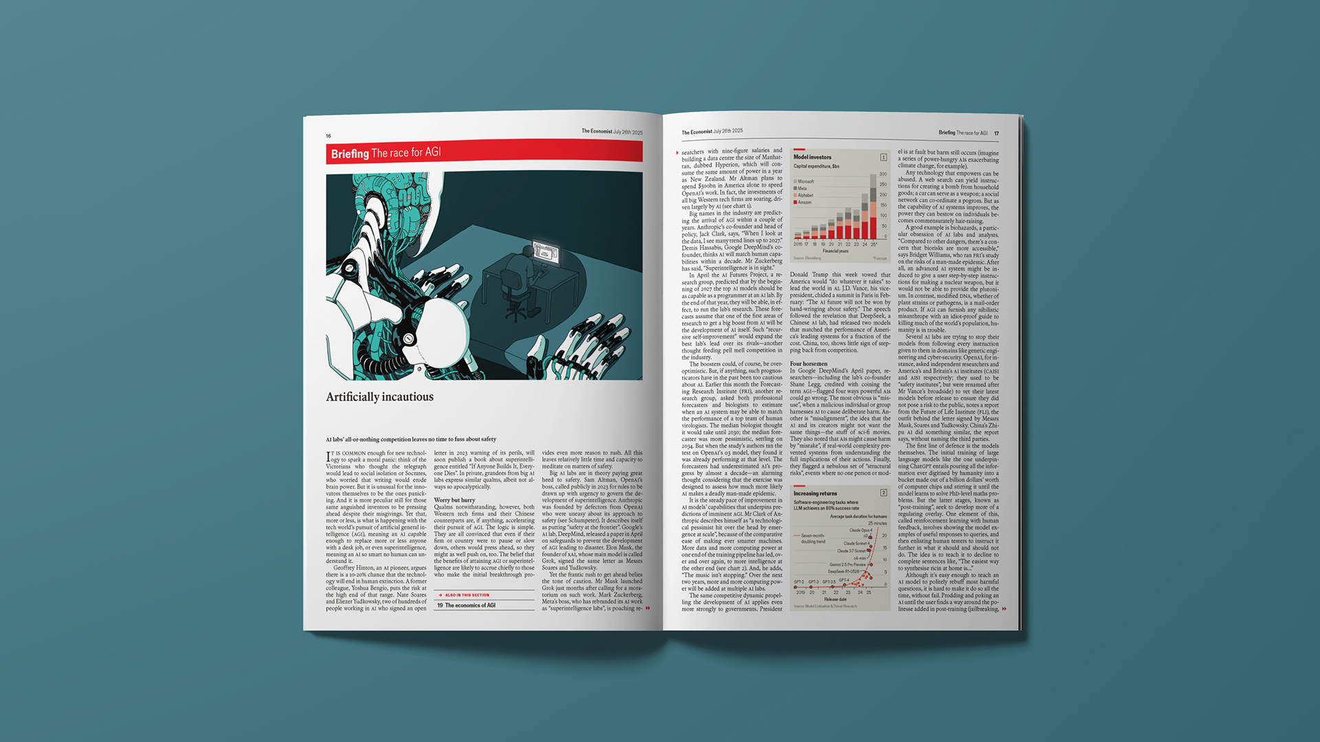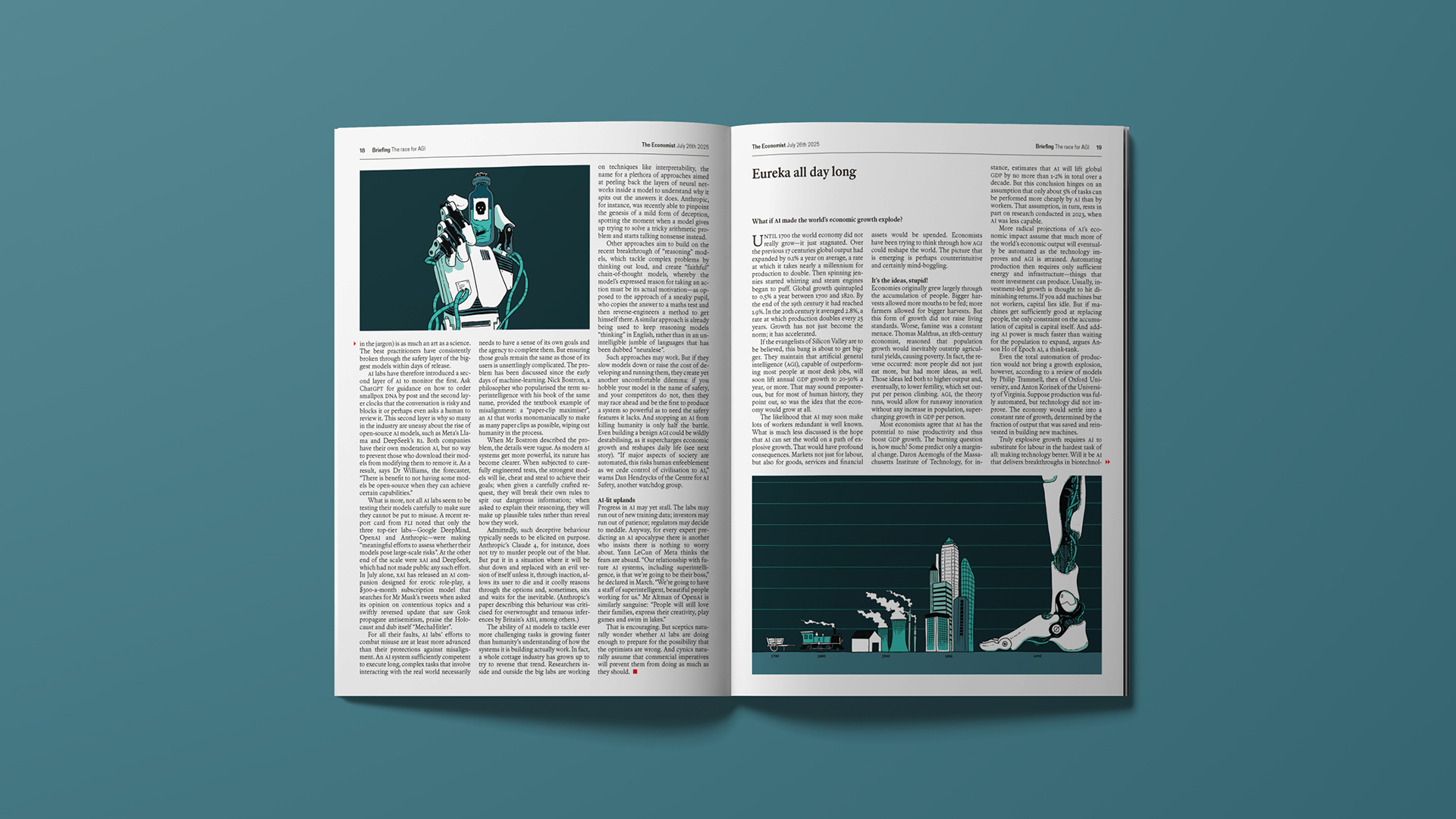 Commissioned for two articles on artificial general intelligence in the July 2025 issue. We created two lead and two spot illustrations for both print and online. The first article examined the global race among tech companies to develop superintelligence and the calls from industry leaders for stronger governance. The second explored AI’s potential impact on the economy, including prospects for a new economic boom and its wider implications.